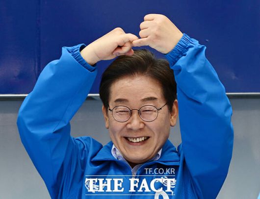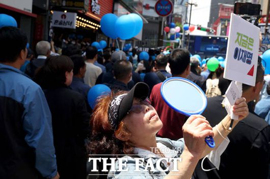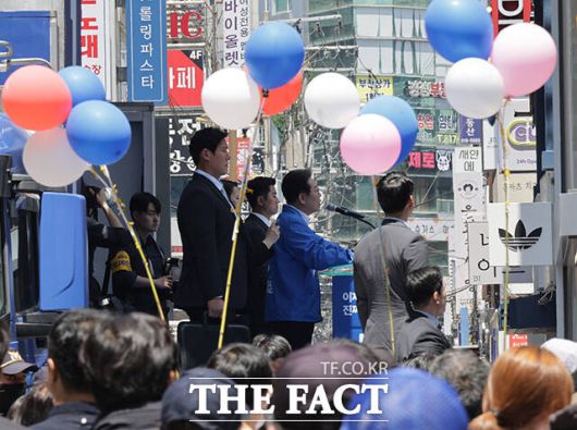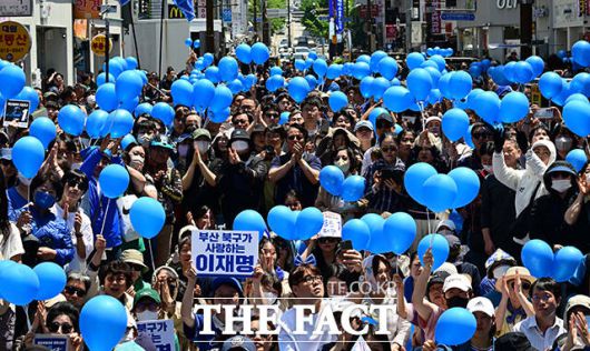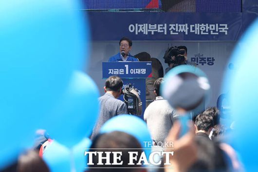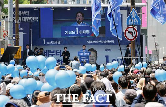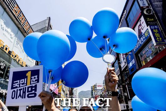 [더팩트ㅣ부산=배정한 기자] 이재명 더불어민주당 대선후보가 14일 부산 부산진구 서면 쥬디스태화 인근에서 열린 집중유세에 참석한 가운데 지지자들이 저격에 대비해 거울과 풍선을 들고 있다.