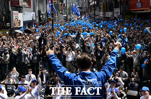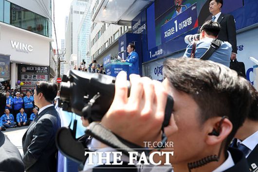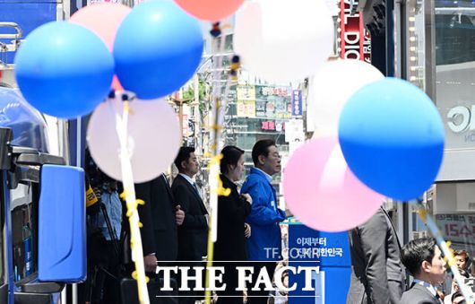 이재명 더불어민주당 대선후보가 14일 부산 부산진구 서면 쥬디스태화 인근에서 열린 집중유세에 참석한 가운데 지지자들이 저격에 대비해 거울과 풍선을 들고 있다. /부산=배정한 기자 |
