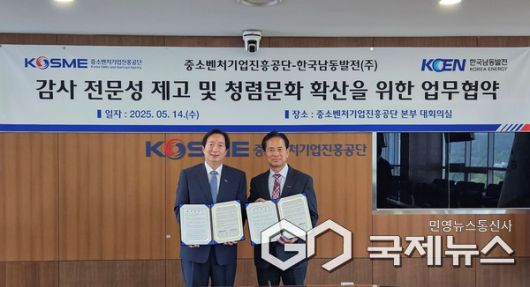(진주=국제뉴스) 구정욱 기자 = 중소벤처기업진흥공단은 14일 경남혁신도시 진주 본사에서 한국남동발전과 감사 역량 강화 및 청렴·윤리 확산을 위한 업무협약을 체결했다.
