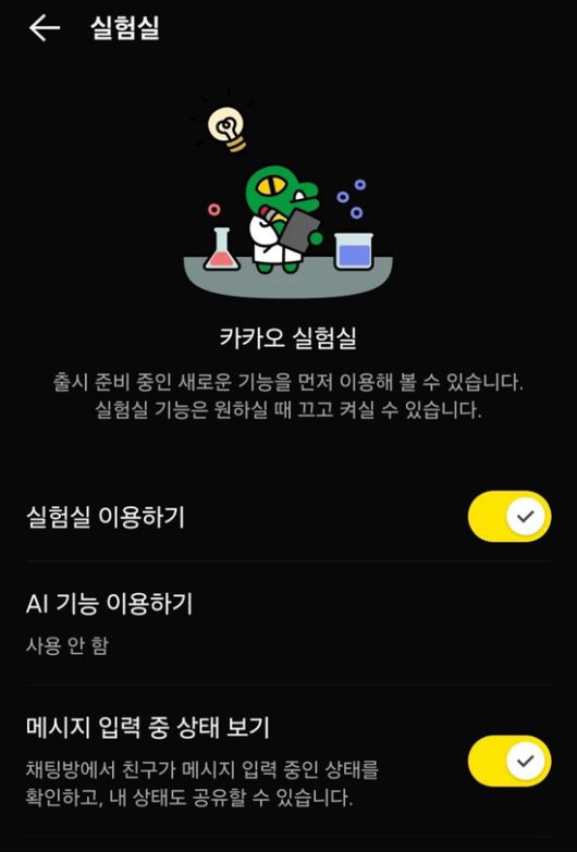 14일 카카오는 전날 이러한 내용의 카카오톡 업데이트를 진행했다고 밝혔다. 메시지 입력 상태를 보여주는 기능은 카카오톡 내 카카오 실험실 항목에서 ‘메시지 입력 중 상태 보기’ 활성화를 통해 선택할 수 있다. 이 기능을 켜면 카카오톡에서 상대방이 메시지를 입력할 때 노란색 점들이 나타나 실시간으로 대화 준비 상황을 알 수 있다. 다만, 대화를 주고 받는 이용자 모두 이 기능을 활성화해야 메시지 입력 상태가 표시된다.