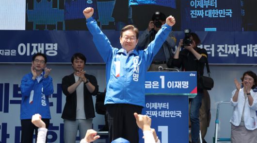 더불어민주당 이재명 대선후보가 14일 부산시 부산진구 서면젊음의거리에서 열린 부산유세에서 손을 들어 지지자들에게 인사하고 있다. 김성룡 기자 |
