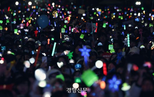 지난해 12월14일 국회 앞에서 열린 국민촛불대행진에 참석한 시민들이 대통령 윤석열 탄핵안이 가결되자 응원봉을 흔들고 있다. 권도현 기자 |