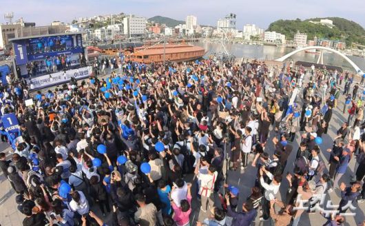 더불어민주당 이재명 대선 후보가 14일 경남 통영시 강구안 문화마당에서 열린 유세에서 지지자들에게 인사하고 있다.