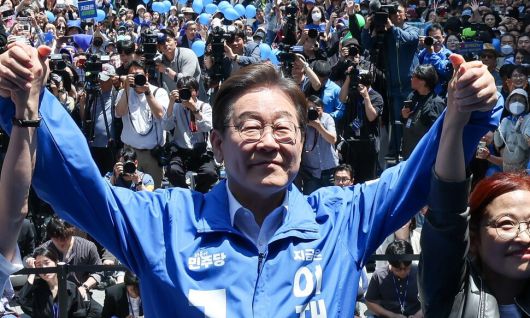 이재명 더불어민주당 대통령 후보가 14일 부산 부산진구 서면 젊음의 거리에서 열린 유세에서 인사하고 있다. 공동취재사진 |