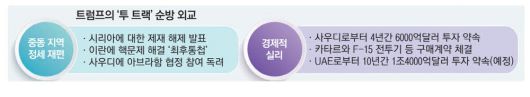 시리아에 대해서는 독재정권 붕괴 후 새로운 과도정부와 관계 개선에 나섰고, 이란에 대해서는 핵 개발 중단과 관련한 '최후통첩'을 던지며 중동 지역 '새판 짜기'를 본격화했다. 그런가 하면 사우디아라비아로부터 4년간 6000억달러(약 850조원)의 투자 유치를 약속받는 경제 동반자 협정을 맺는 등 실리도 챙기며 특유의 '거래의 기술'을 발휘하고 있다.