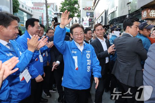 이재명 더불어민주당 대통령 후보가 14일 오후 경남 거제시 엠파크 차없는 거리를 찾아 지지를 호소하고 있다. 2025.5.14/뉴스1 ⓒ News1 안은나 기자 |