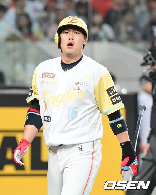 [OSEN=대전, 김성락 기자] 14일 대전 한화생명볼파크에서 ‘2025 신한 SOL Bank KBO리그’ 한화 이글스와 두산 베어스의 경기가 열렸다. 이날 한화는 문동주, 두산은 잭로그를 선발로 내세웠다. 3회말 1사 한화 하주석이 삼진아웃된 뒤 아쉬워하고 있다. 2025.05.14 / ksl0919@osen.co.kr