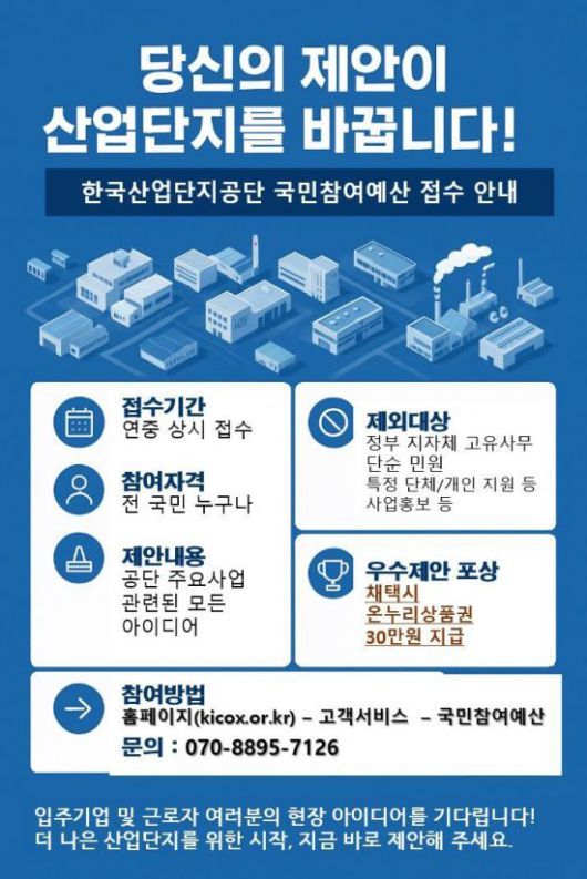 한국산업단지공단은 산업단지의 지속가능한 발전과 현장 중심의 예산 운영을 위해 2025년도 국민참여예산 제안 접수를 5월부터 연중 상시로 운영한다고 14일 밝혔다.