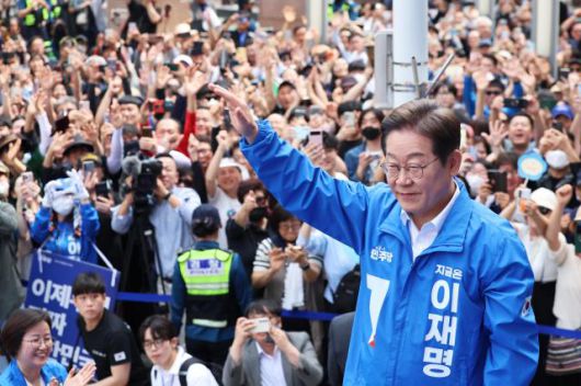 이재명 더불어민주당 대선 후보가 14일 경남 창원시 상남분수광장에서 열린 집중 유세에서 지지자들에게 인사하고 있다. [사진=연합뉴스] |