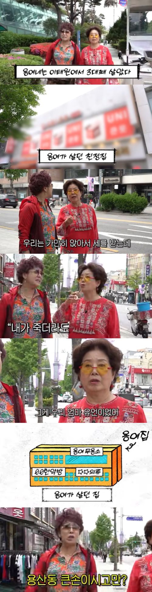 이명화는 "왜 여기서만 쭉 살았냐?"고 물었고, 선우용여 "지금은 안 산다. 지금은 세를 받고, 난 이제 지금 동부 이촌동에 산다"며 "우리집은 저기 있는 빨간색 간판 있는 곳이다. 그 집은 65년 됐다"며 이태원에 위치한 친정집을 소개했다.