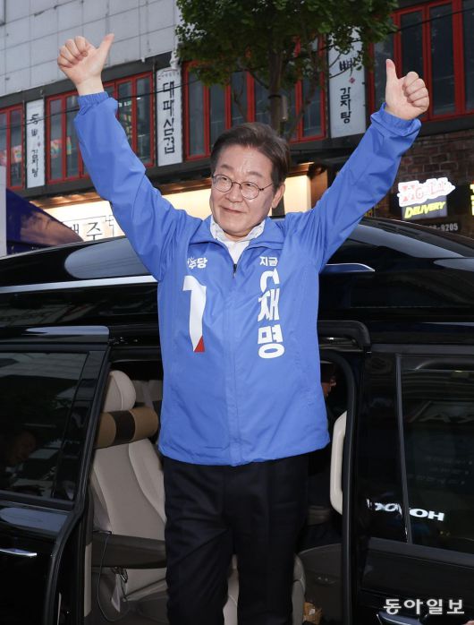 이재명 더불어민주당 대선 후보가 14일 오후 경남 거제시 고현로 유세장을 떠나며 시민들에게 인사하고 있다.