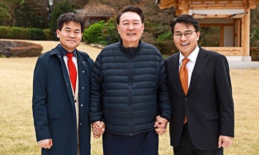 한국사 강사 전한길(왼쪽)씨가 지난달 9일 서울 용산구 한남동 관저에서 윤석열 전 대통령을 만난 모습. 전한길뉴스 |