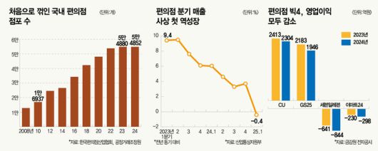 편의점 위기는 통계에서 극명하게 드러난다. 매년 성장을 이어온 점포 수가 처음으로 꺾였고 전년 대비 분기 매출도 사상 첫 마이너스를 기록했다.