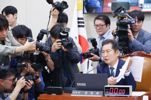 “이것이 불출석 사유서” 국회 법제사법위원회가 14일 연 ‘사법부 대선 개입 의혹 진상규명 청문회’에서 정청래 위원장이 대법관들이 낸 불출석 사유서를 내보이고 있다. 한수빈 기자 |