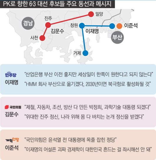 6·3 대선 주요 후보들이 공식 선거운동 3일째인 14일 일제히 부산·경남(PK)을 찾았다. 이재명 더불어민주당 후보는 해양수산부와 HMM 이전 등 지역 맞춤형 공약을 내놓으며 보수세가 강한 영남 표심에 호소했다. 김문수 국민의힘 후보는 박정희 전 대통령을 소환하며 보수 지지층 결집을 시도했다.
