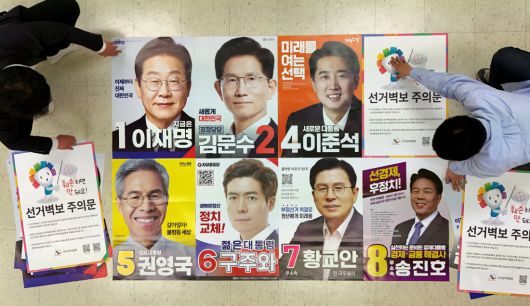선거 벽보 준비 이상무…이 안에 대한민국 ‘미래’ 있다 선거관리위원회 관계자들이 14일 서울 중구선관위에서 제21대 대통령 선거 후보자들로부터 제출받은 선거 벽보를 확인하고 있다. 후보자 벽보는 오는 17일까지 전국 공공장소 8만여곳에 부착될 예정이다. 사진공동취재단
