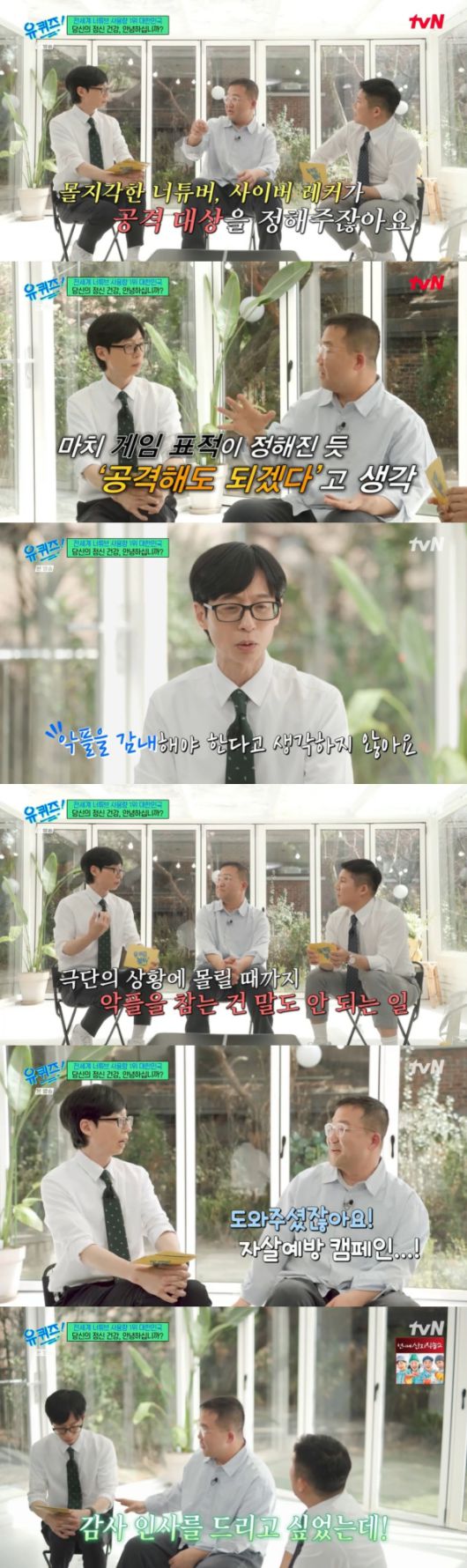 유재석은 "저는 늘 얘기드리지만 악플을 감내해야 한다고 생각하지 않는다. 안타까운 일이 생길 때도 그렇지만 악플을 감내하고 당연히 받아들여야 하는 걸로 인식하는 게 너무 슬프고 가슴 아프다"고 밝혔다.