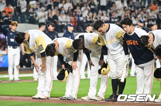 [OSEN=대전, 김성락 기자] 프로야구 두산 베어스가 강습 타구에 발목을 맞고 교체된 잭로그의 부상 악재를 극복하고 연승에 성공했다. 두산은 14일 대전 한화생명볼파크에서 열린 2025 신한 SOL Bank KBO리그 한화 이글스와의 원정경기를 7-1로 승리했다. 경기 종료 후 한화 선수들이 관중에게 인사하고 있다. 2025.05.14 / ksl0919@osen.co.kr