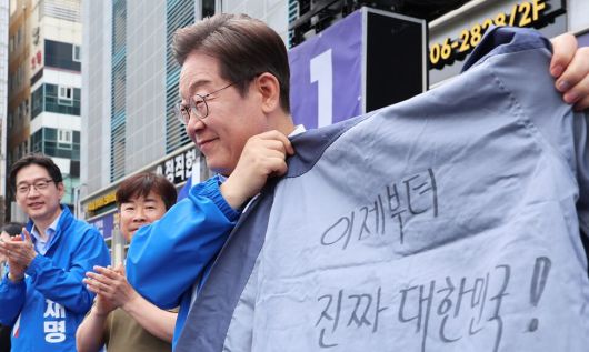 이재명 더불어민주당 대통령 후보가 14일 경남 창원시 상남분수광장에서 열린 집중 유세에서 송순호 경남도당위원장으로부터 ‘이제부터 진짜 대한민국!’이라는 손글씨가 적힌 작업복을 전달받은 뒤 들어보이고 있다. 공동취재사진 |