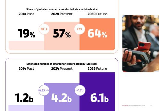 결제 기술의 진화는 소비 방식 변화에 기인한다. 2020년, 코로나 팬데믹을 기점으로 비대면 결제 수요가 증가했고, 전자상거래 규모도 빠르게 확장했다. 보고서에 따르면 전 세계 전자상거래 지출은 2014년 1조 2000억 달러(약 1683조 원)에서 2024년 6조 8000억 달러(약 9537조 원)로 6배 이상 증가했다. 이 중 스마트폰으로 결제한 비중은 2014년 19%에서 2024년 57%에 달한다. 스마트폰 사용 비중 증가에 따라 소비자 지출 방식의 재편이 이뤄진 셈이다.