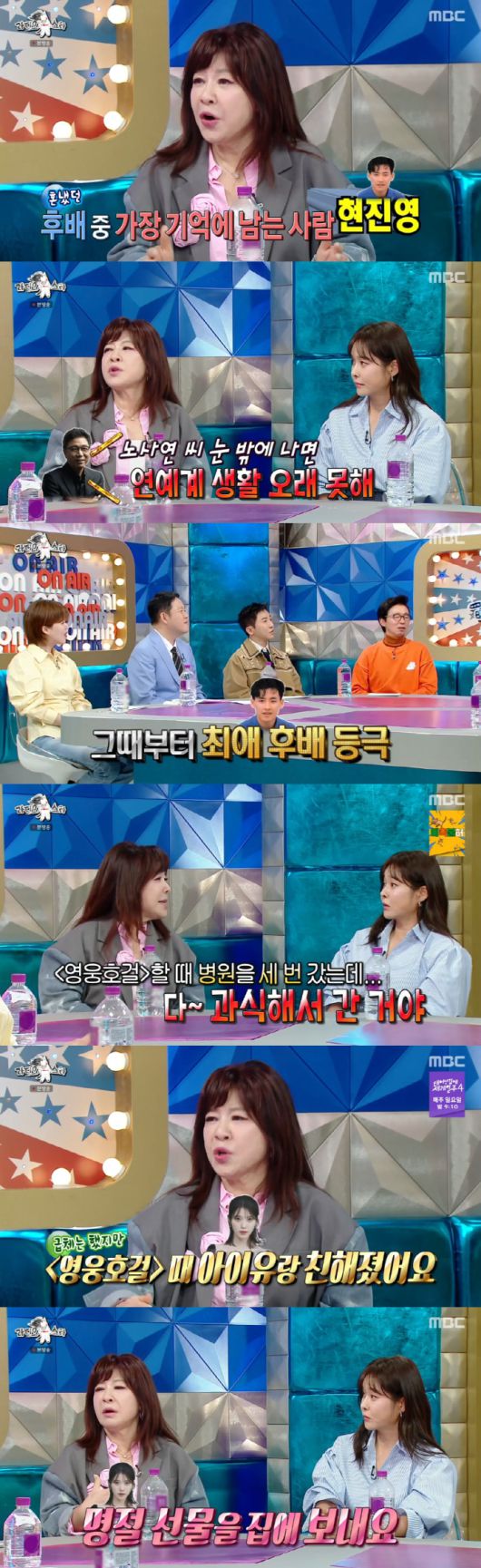 노사연은 "그때 현진영이 제일 잘 나갈 때였는데 내가 콘서트 하는데 자기 몸만 한 꽃다발을 들고 와서 인사했다. 그때부터 내가 되게 예뻐했다"고 말했다.
