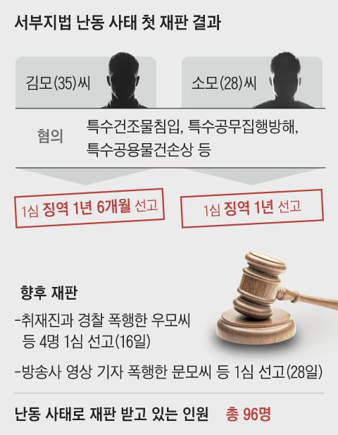 지난 1월 윤석열 전 대통령 구속영장 발부에 반발해 지지자 수백 명이 경찰 저지를 뚫고 법원을 습격하고 경찰을 폭행한 초유의 ‘서부지법 난동 사태’에 가담한 남성 2명이 14일 실형을 선고받았다. 사태 넉 달 만에 나온 첫 법원 선고다. 이번 사건으로 재판을 받고 있는 인원은 총 96명으로, 법조계에선 다른 사건에서도 실형 등 중형이 선고될 것이란 전망이 나온다.