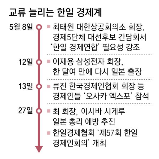 최 회장은 지난달 국회 ‘미래산업포럼’ 발족식 기조연설과 이달 8일 경제5단체와 더불어민주당 이재명 대선 후보 간담회 등에서 ‘한일 경제연합’의 필요성을 역설했다. 최 회장은 “우리가 지금까지 해왔던 비즈니스 방법론을 바꾸지 않으면 살아남기 어렵다”며 “유럽연합(EU) 모델과 같이 한국과 일본도 경제적 연합을 통해 시장 규모를 키우고, 대외적으로 ‘룰 세터(rule setter·규칙을 만드는 자)’ 위치에 설 수 있도록 해야 한다”고 언급했다.