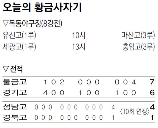 이어 열린 8강전 두 번째 경기에선 성남고가 경북고에 연장 10회 승부치기 끝에 4-1로 승리했다. 정규 이닝을 0-0으로 마친 뒤 연장에 들어간 성남고는 10회 1사 만루에서 이진혁(18)의 밀어내기 볼넷으로 선취점을 뽑았다. 후속 타자 이서준(18)이 포수 파울플라이로 물러났지만 백서진(18)이 우익수 키를 넘기는 3타점 싹쓸이 2루타를 치며 승부에 쐐기를 박았다. 승리는 기록하지 못했지만 성남고 선발 조윤호(18)는 8이닝 5피안타 1볼넷 5탈삼진 무실점으로 호투했다. 성남고는 1970년 이후 55년 만에 황금사자기 우승에 도전한다.