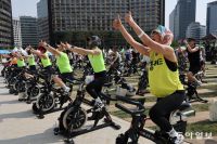 14일 서울 중구 서울광장에서 진행된 ‘2025 서울헬스쇼’에선 다양한 체험 행사가 열려 시민들의 호응을 얻었다. 참가자들이 단체로 음악에 맞춰 율동 등을 하며 자전거를 타는 ‘재키사이클 스피닝 체험’ 행사. 홍진환 기자 jean@donga.com |