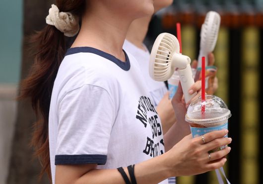 절기상 더위가 그친다는 처서인 22일 오후 서울 종로구 광화문사거리에서 시민들이 아이스 커피와 휴대용 선풍기를 들고 길을 지나가고 있다. 2024.08.06. [서울=뉴시스] |