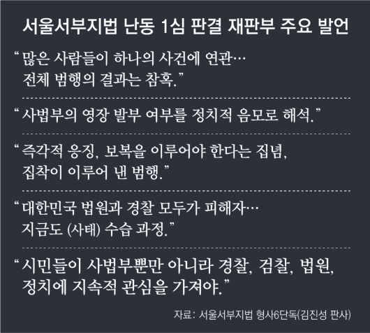 이날 재판부는 선고 전 이례적으로 소회도 밝혔다. 재판부는 “이 사건에서 대한민국 경찰, 법원이 모두 피해자”라며 “피해를 입은 경찰과 법원 구성원들과 기자를 포함해 지금도 수습 중인 관계자 모두에게 감사드린다”고 말했다. 피고인들을 향해선 “선고가 피고인의 인생을 좌우하지도 않는다. 남은 인생은 본인답게 살아가길 바란다”고 했다.
