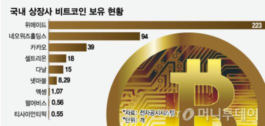 14일 금융감독원 전자공시시스템에 따르면 비트코인을 가장 많이 보유한 국내 상장사는 게임업체 위메이드(223개)였다. 또 네오위즈홀딩스(94개), 넷마블(8.29개), 펄어비스(0.56개) 등 게임사가 주로 비트코인을 보유하고 있다. 여러 게임사가 블록체인 기반 게임을 개발하고 있어 비트코인 등 주요 가상자산은 블록체인 운영 자금이나 보상 수단으로 활용될 수 있다.