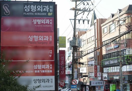 서울 강남구의 한 건물에 성형외과 간판이 줄지어 걸려 있다. 연합뉴스 |