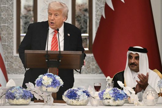 도널드 트럼프 미국 대통령이 14일(현지시간) 카타르에서 국빈 만찬 중 발언하고 있다. [AFP} |