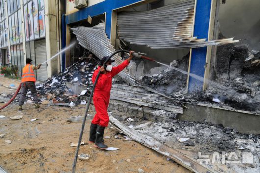 [트리폴리= AP/뉴시스] 무장 군대들 간의 충돌로 파괴된 리비아 수도 트리폴리 거리에서 5월 14일 소방대가 한 서점 화재의 잔불을 끄고 있다. 2025. 05. 15. |