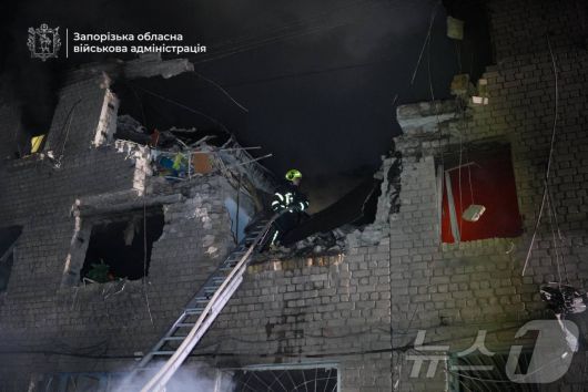 1일(현지시간) 우크라이나 자포리자에서 러시아 군의 포격을 받은 건물서 소방대원이 진화를 하고 있다. 2025.05.02 ⓒ AFP=뉴스1 ⓒ News1 우동명 기자 |