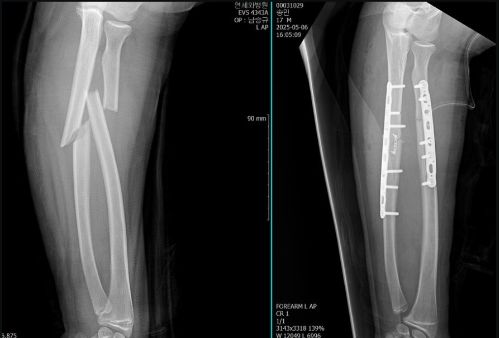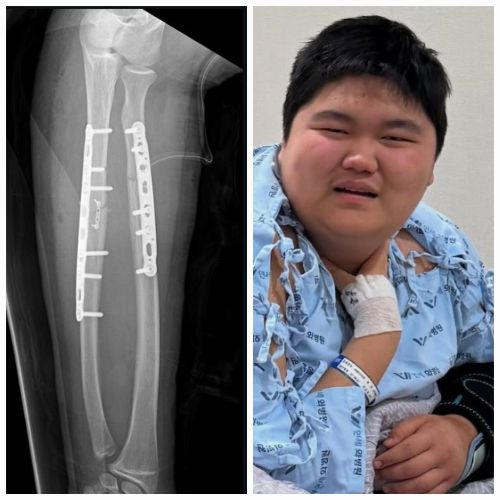 공개된 사진에는 민이의 팔 뼈 골절 전후 엑스레이와 수술 후 모습이 담겼다. 한 장의 엑스레이 사진에서는 팔뼈가 완전히 부러진 모습이, 다른 사진에서는 철심과 플레이트로 단단히 고정된 모습이 포착됐다.