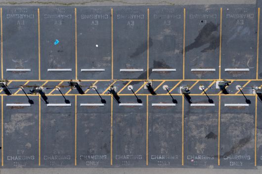 14일(현지시간) 미국 캘리포니아 오션사이드에서 드론으로 본 전기 자동차 충전소. [로이터] |