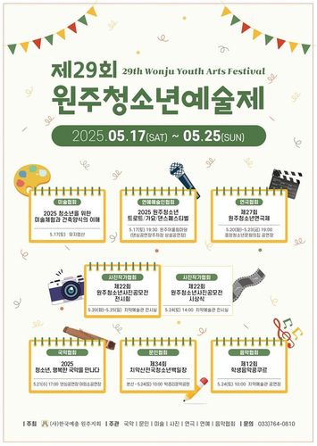 주요 행사로는 ▲ 청소년 트로트·가요·댄스 페스티벌(17일) ▲ 청소년을 위한 미술체험과 건축양식의 이해(17일) ▲ 청소년연극제(20∼23일) ▲ 청소년사진공모전전시회(20∼25일) ▲ 청소년, 행복한 국악을 만나다(21일) ▲ 치악산전국청소년백일장(24일) ▲ 학생음악콩쿠르(24일) 등이 열린다.