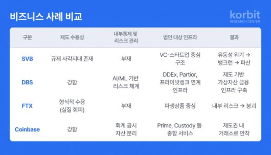 보고서에 따르면 SVB와 FTX는 기술 중심 전략과 빠른 성장으로 시장을 장악했으나 내부통제 미비, 자산 분리 실패, 규제 회피 등 구조적 결함으로 인해 결국 붕괴했다. 반면, DBS와 코인베이스는 회계 투명성, 자산 수탁 체계, 규제 준수 등 제도권 기준을 충실히 이행하며 법인 고객의 신뢰를 확보하고 지속 가능한 성장 기반을 마련했다.