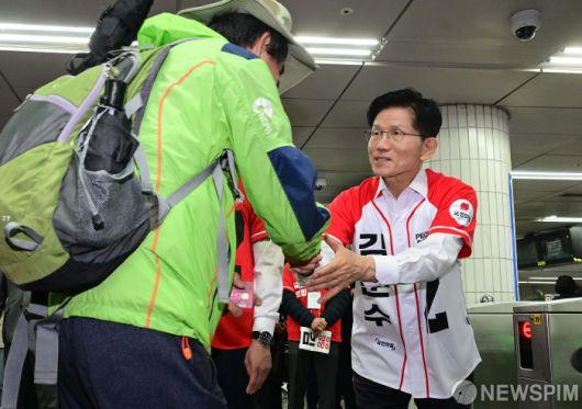 [서울=뉴스핌] 최지환 기자 = 김문수 국민의힘 대통령 후보가 15일 오전 서울 구로구 신도림역에서 출근길 시민들과 인사를 나누고 있다. 2025.05.15 choipix16@newspim.com |
