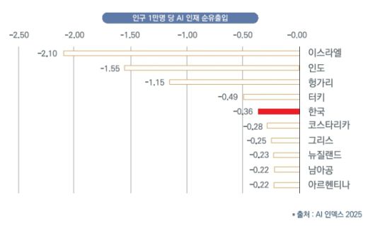 인재 육성 및 유치 정책은 과거 정부들도 지속적으로 강조해 왔지만 한국은 여전히 인재 유출국 지위다. OECD는 한국을 AI 인재 유출국으로 분류(1만명당 0.3명 순유출)하고 있다. 스탠퍼드대 HAI의 'AI 인덱스 2025'에서도 한국은 이스라엘, 인도, 헝가리, 터키에 이어 5번째로 AI 인재 유출이 심한 국가로 조사됐다.