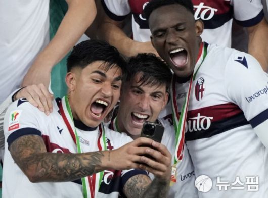 [로마 로이터 =뉴스핌] 박상욱 기자 = 볼로냐 선수들이 15일 코파 이탈리아 우승을 차지한 뒤 셀카를 찍으며 기뻐하고 있다. 2025.5.15 psoq1337@newspim.com