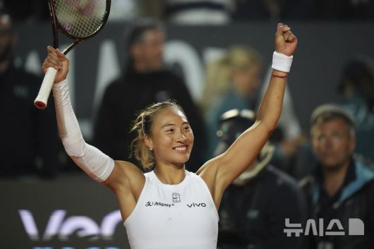 [로마=AP/뉴시스] 정친원(8위·중국)이 14일(현지 시간) 이탈리아 로마 포로 이탈리코에서 열린 여자프로테니스(WTA) 투어 BNL 이탈리아 인터내셔널(이탈리아오픈) 단식 8강전에서 아리나 사발렌카(1위·벨라루스)를 꺾은 후 기뻐하고 있다. 정친원이 2-0(6-4 6-3)으로 승리하고 4강에 올라 코코 고프(3위·미국)와 결승 진출을 다툰다. 2025.05.15.
