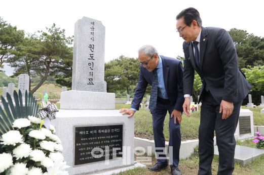 김완기 특허청장(오른쪽)이 15일 국립대전현충원에서 독립운동 발명가 권도인 선생의 후손인 폴 아리나가(Paul Stuart Arinaga)씨에게 비문판 내용에 대해 설명하고 있다. (사진=특허청 제공) |
