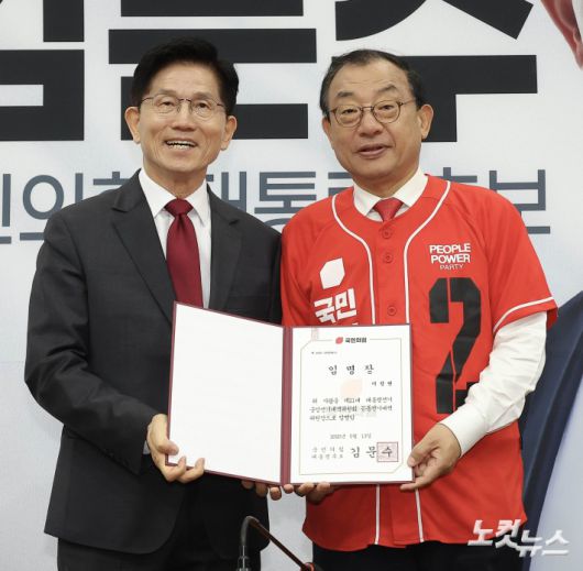 김문수 국민의힘 대선 후보가 15일 서울 여의도 국회에서 열린 중앙선대위 회의 및 중앙선대위 임명장수여식에서 이정현 공동선대위원장에게 임명장을 수여하고 있다.