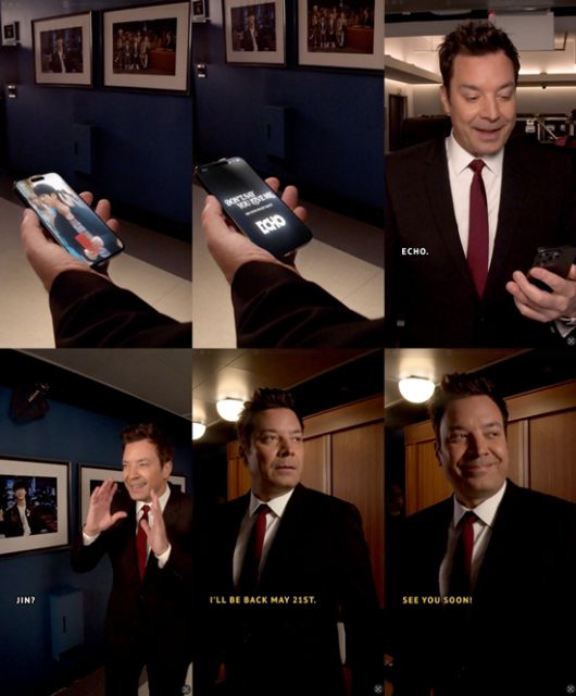 '지미 팰런쇼'는 지난 14일 오후 공식 SNS에 진의 출연을 예고하는 영상을 깜짝 게재했다. 영상에는 지미 팰런이 휴대전화로 진의 신곡 '돈트 세이 유 러브 미' 티저를 감상하며 "에코…"라고 속삭이는 장면이 담겼다.