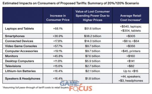 비디오 게임 콘솔은 전체 생산되는 콘솔 생산량의 약 87%를 공급하는 중국 규제 여파로 현재 공급되고 있는 소비자 가격대비 최대 428달러가 상승한 69%의 가격상승이 이뤄질 것으로 전망했다. 이는 주요 소비자 가전제품 중 가장 가파른 가격 상승률을 보여주고 있으며 고가격의 여파로 콘솔을 구입하는 소비자가 73% 줄어들 것으로 예상되고 전체 구매력이 약 120억 달러(한화 약 16조 8500억 원) 줄어들 것으로 예측했다.