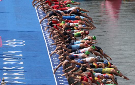 2024 파리올림픽 트라이애슬론 경기가 열린 지난해 7월 31일 프랑스 파리 알렉산드르 3세 다리에서 출전 선수들이 센강으로 뛰어들고 있다. 트라이애슬론 남자 경기는 당초 같은 달 30일에 진행될 계획이었으나 센강 대장균 검출 수치 초과 등 수질 문제가 발생해 하루 연기됐었다. 파리=서재훈 기자