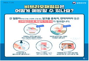 지영미 질병관리청장은 “비브리오패혈증은 어패류, 게, 새우 등 익히지 않은 음식 섭취를 피하는 등 예방수칙을 준수하는 것이 중요하다”며 “특히 만성 간질환자, 당뇨병, 알콜의존자 등의 기저질환을 가진 고위험군은 치사율이 높으므로 더욱 주의해야 한다”고 강조했다.